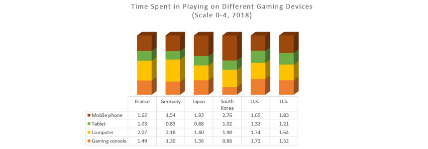 It is interesting to determine the time normally invested by game enthusiasts across different countries as an opportunity to draw some general behavioral patterns and established tendencies. What do you believe to be the average number of hours spent playing video games? What country do you find most likely to take a lead in most hours of time invested in playing video games? How about the most invested age group or the primary gaming device employed by gamers to lighten up the mood?